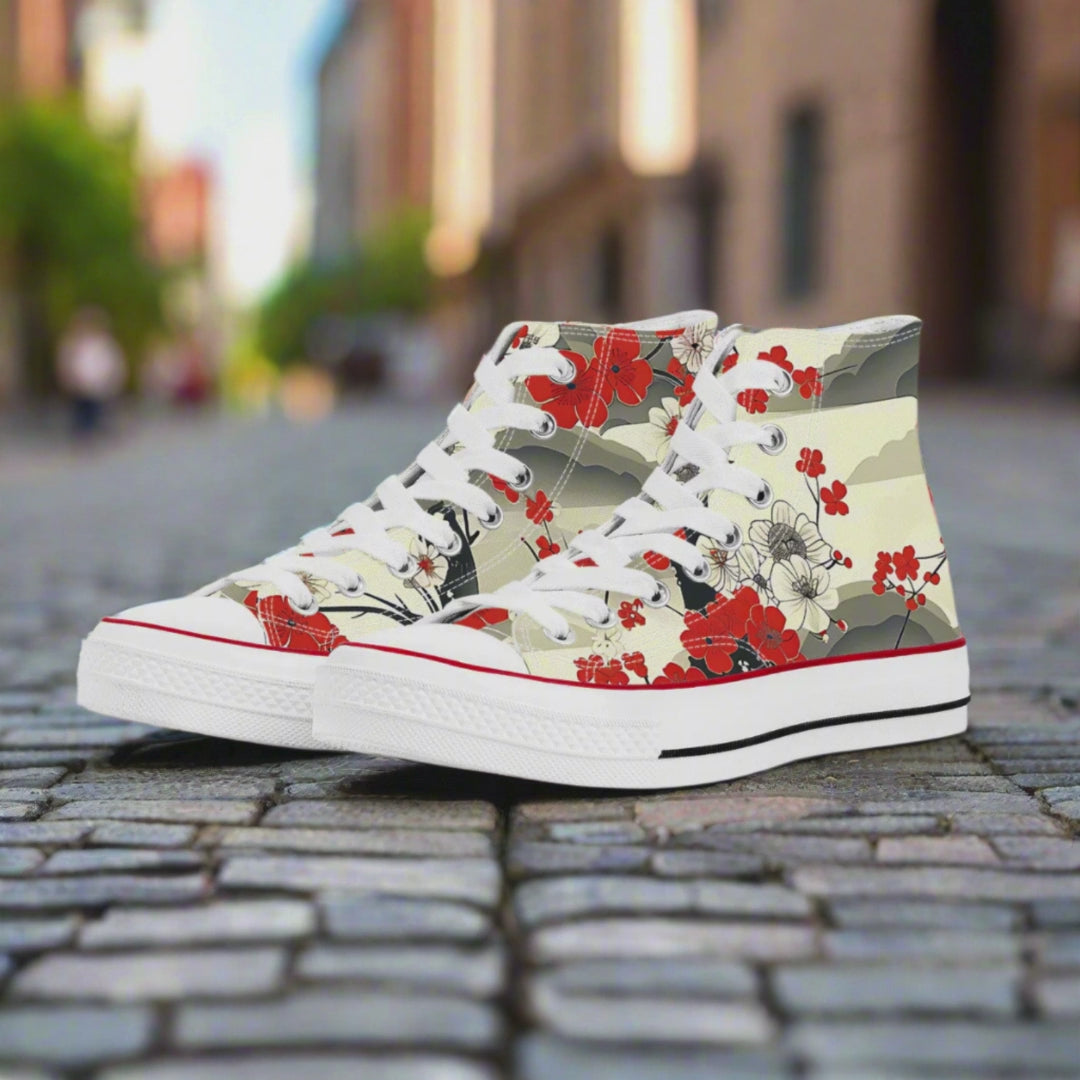 Black Low-Top Sneakers with Pink Cherry Blossom Print