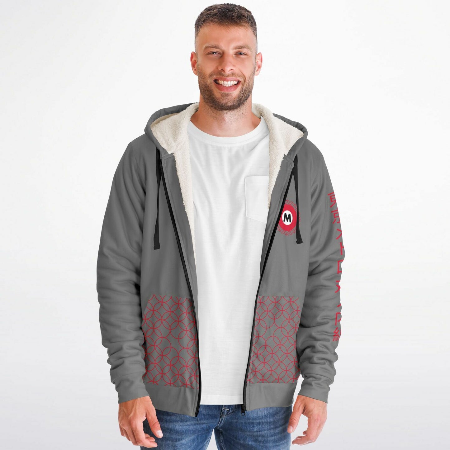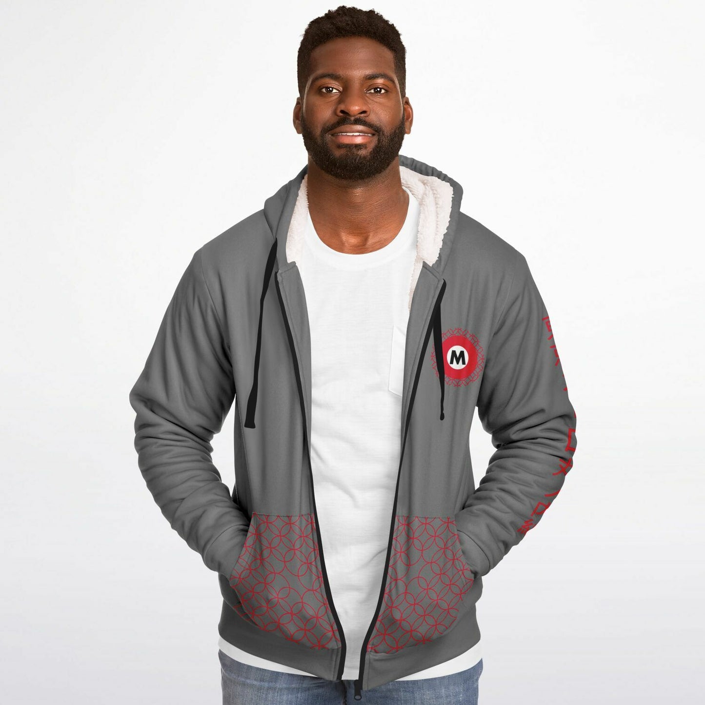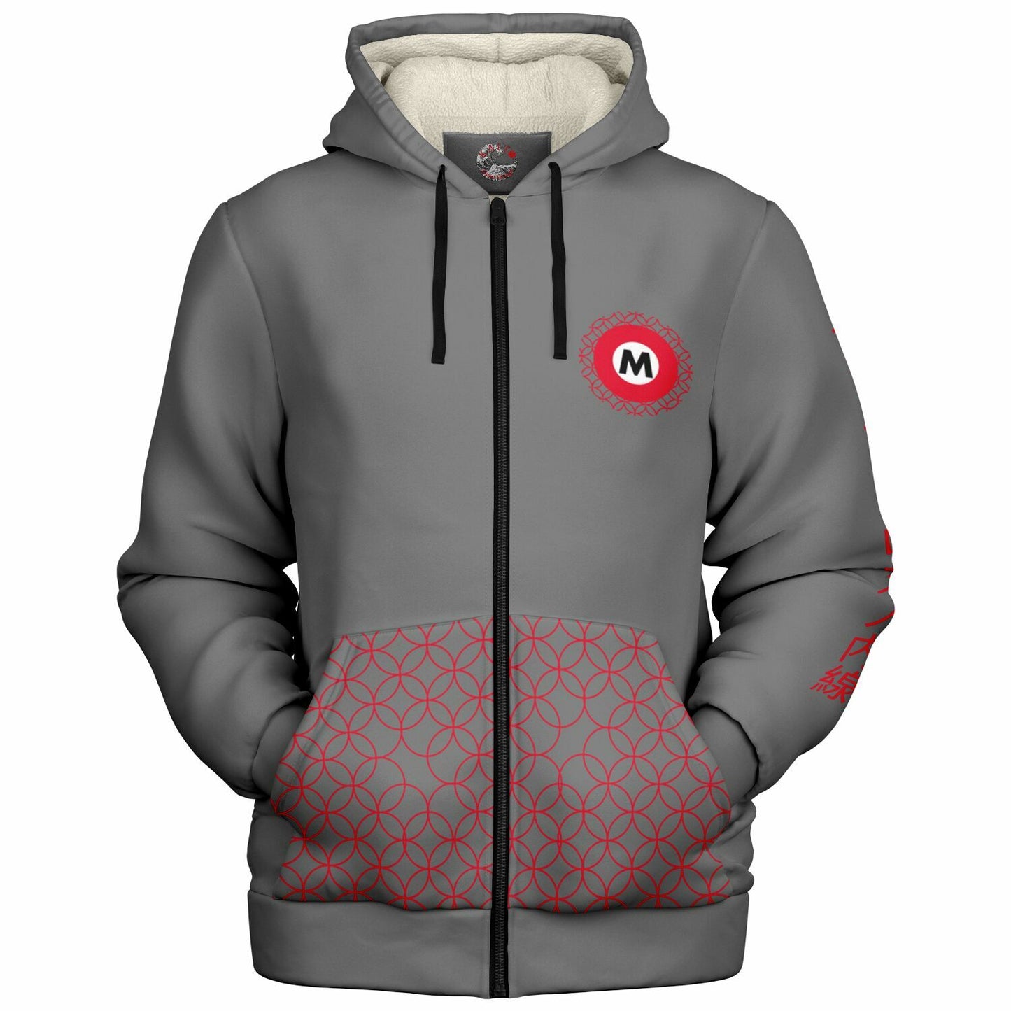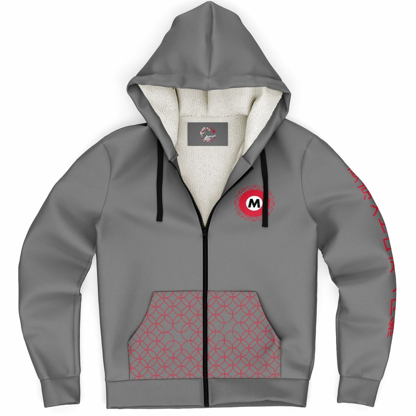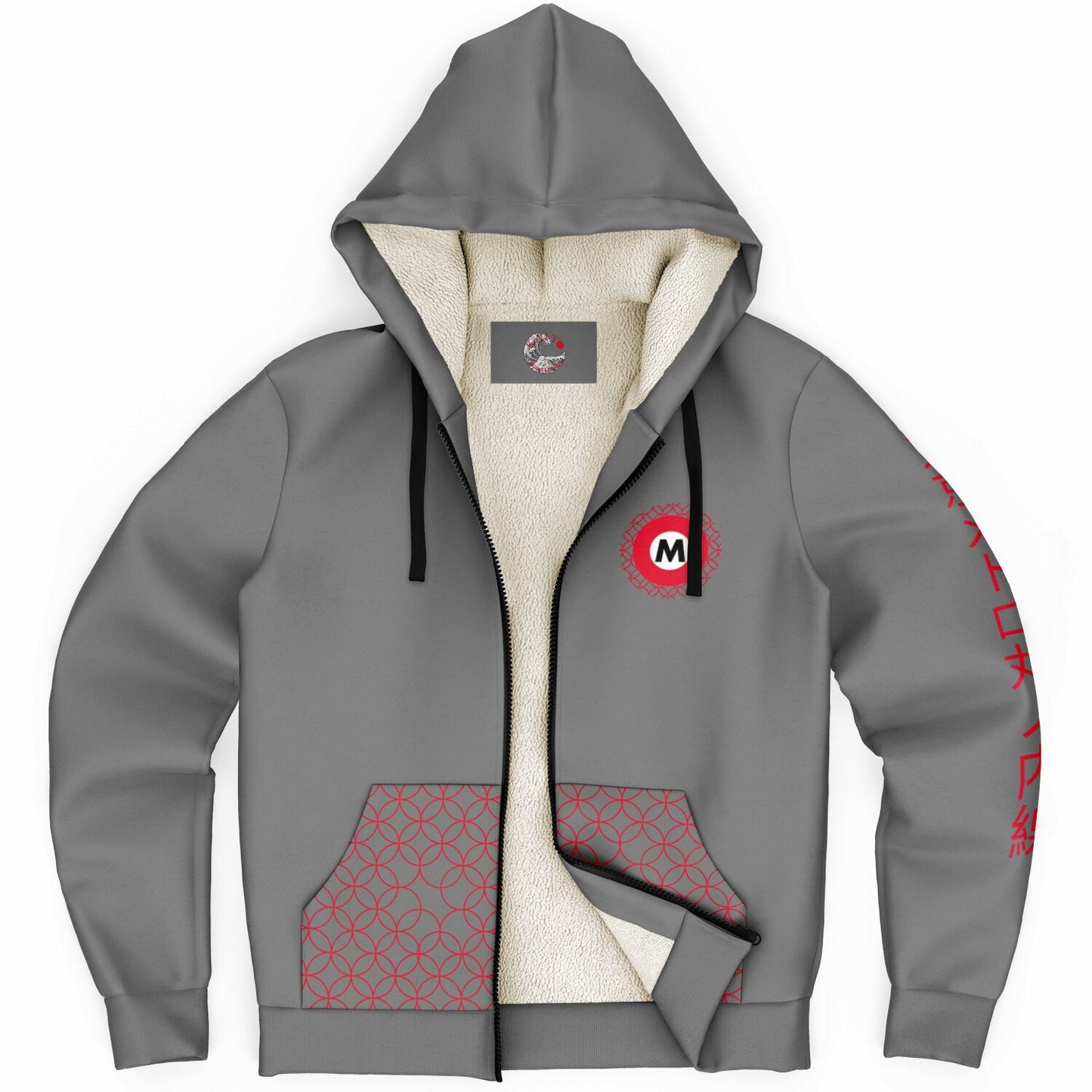 Experience cozy comfort and Japanese urban style with our "Marunouchi Line Ultra-Soft Microfleece Zip Hoodie." This soft grey hoodie features a distinctive patterned lining in the hood and pockets, along with authentic red Japanese text on the sleeve and the recognizable red 'M' emblem, a nod to Tokyo's iconic Marunouchi subway line.