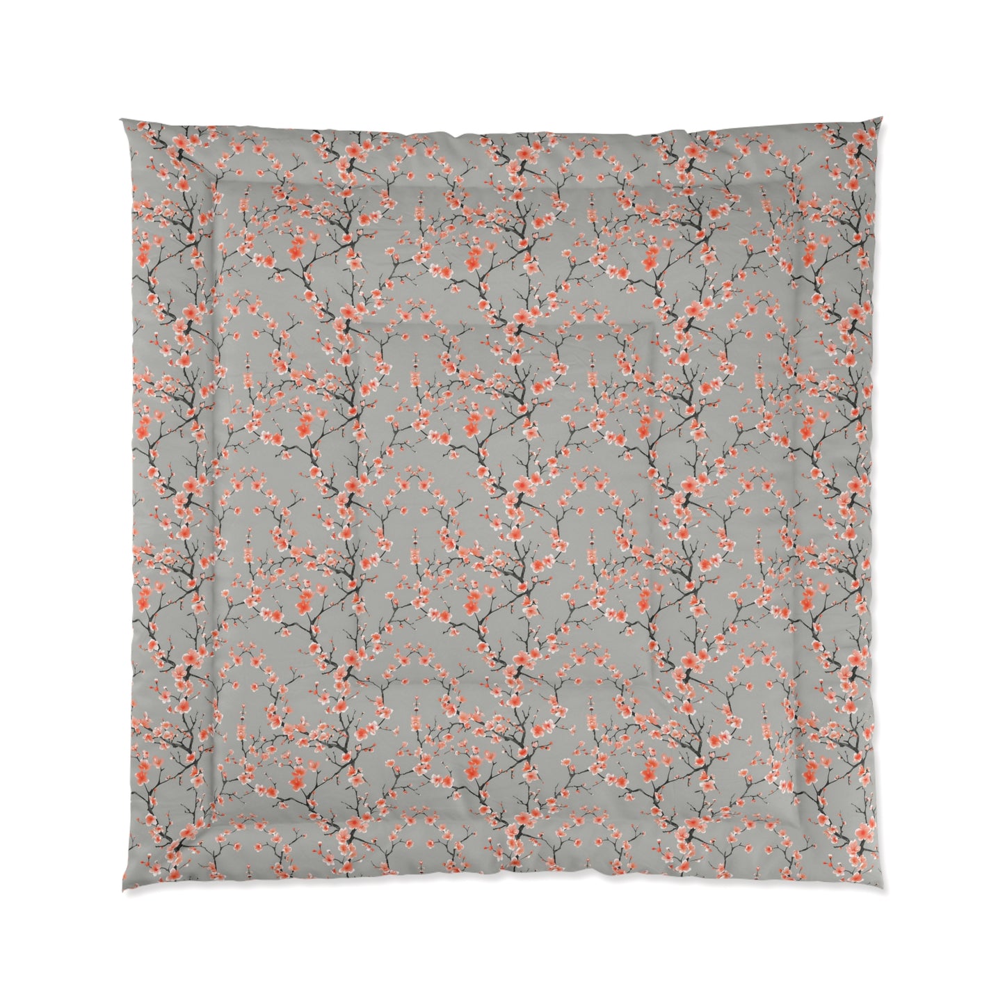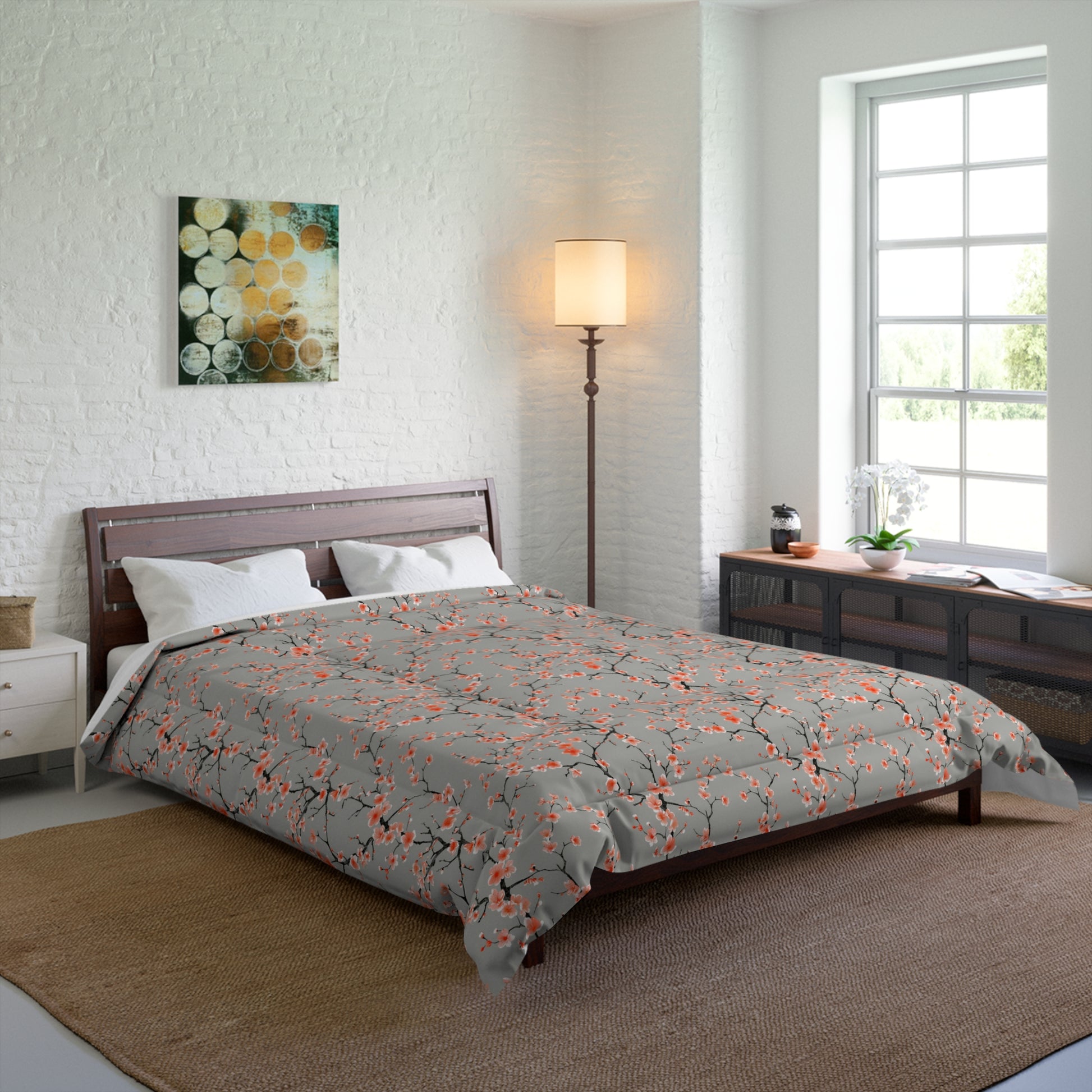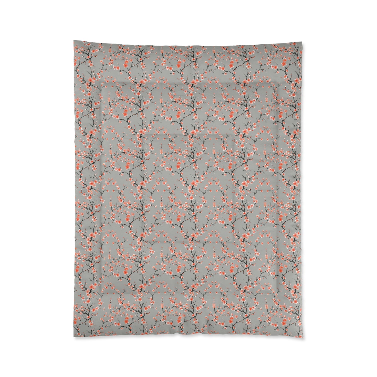 Escape to a serene and tranquil haven with the Peach Blossom Comforter. This delicate comforter features a soft grey background adorned with delicate cherry blossoms in full bloom, evoking the peaceful beauty of a Japanese spring landscape.