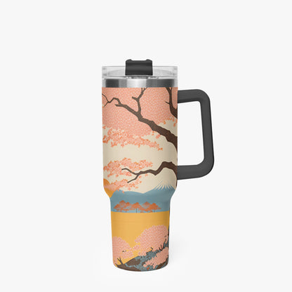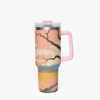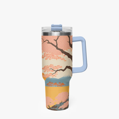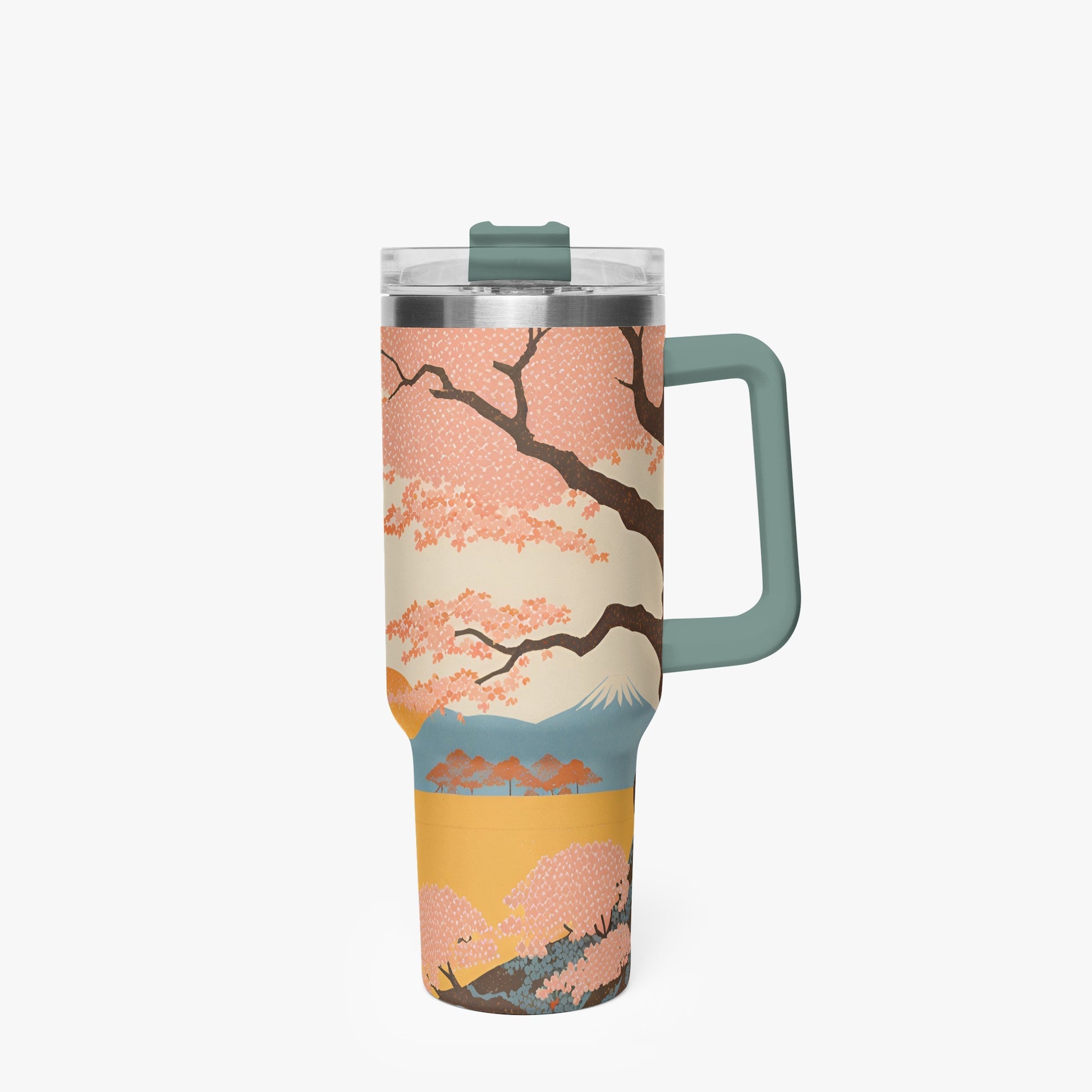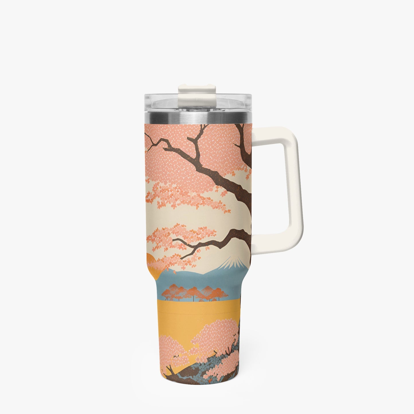 Carry a piece of Japanese artistry with you. This stainless steel tumbler features a vibrant, UV-printed design of a traditional five-storied pagoda, set against rolling hills and blooming cherry blossoms. Experience the serene beauty of Japan with every sip.